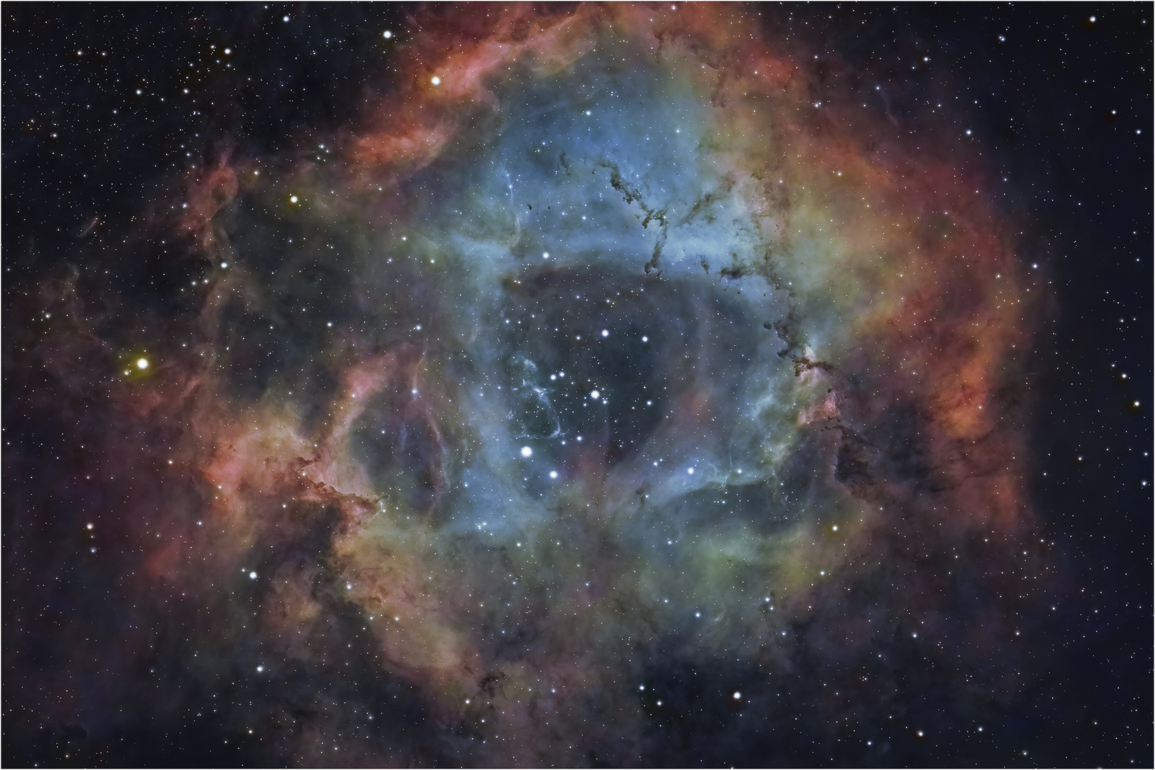 The nebula is called Rosette partly because of its shape, which is slightly reminiscent of a rose, but also for the strong red colour of the H-alpha emission. Unfortunately, with an unmodified DSLR, much of this red emission is not captured by the camera, as a standard DSLR has a filter specifically to blot out this red end of the spectrum. To fully appreciate the nebula therefore requires either a modified camera with the red filter removed, or a dedicated astro camera.